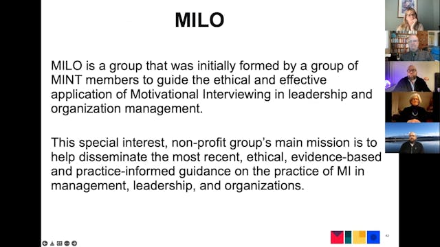 Leaders are a catalyst for change in their organizations. The research is clear that (Motivational Interviewing) MI can greatly support someone through the change process. Join us in a conversation about how the lessons from MI can be used to support leaders in helping individuals and their organization move forward with change. Three leading groups in the application of MI in the leadership space, who have come together to create a new non-profit, will share their thoughts on how you can use these ideas to help the leaders you support learn to use MI in their own leadership approach. William Miller, the founder of MI, will also end the conference with a question and answer interview focused on this new adaptation of MI. This is the recording from the conference on February 18, 2022.